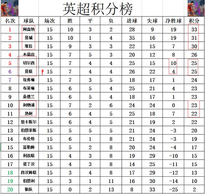 积分榜方面,本轮比赛全部结束,阿森纳的领先优势被曼城缩小到只差2分,维拉差阿森纳3分排在第3。曼联今天客场大胜狼队及时止住颓势,超过利物浦2分,追上切尔西,净胜球劣势排在切尔西之后升至第6。主场惨败的狼队依然是本赛季唯一没有赢球的球队,15轮只拿到2分的他们几乎是预定了一个降级名额。